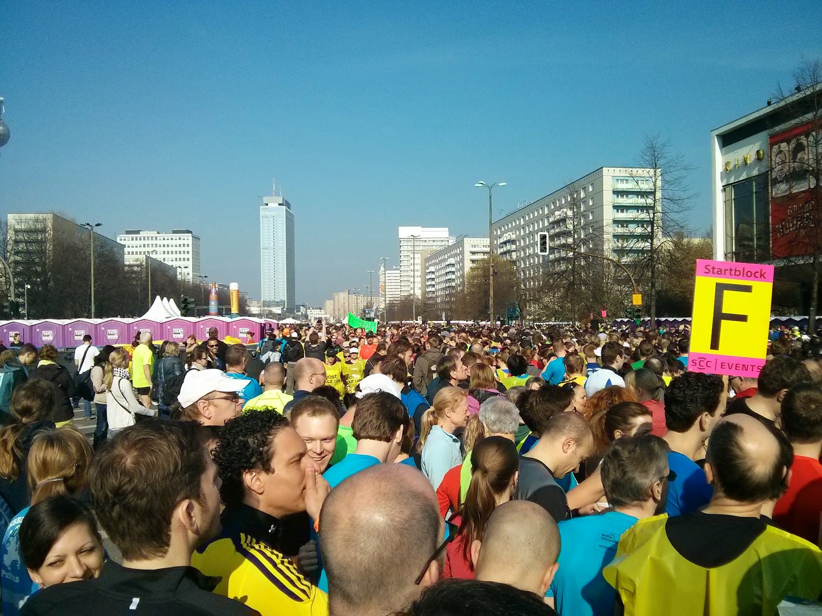 Halb Neun klingelt der Wecker, Achtuhreinunddreißig stehe ich in der Küche, setze Kaffee auf und koche ein Power-Frühstück nach altem traditionellen Rezept. In der Bahn steigen pro Station mehr und mehr Läufer ein und witziger weise auch noch einige betrunkene vom Vorabend. Wir steigen am Alex aus und plötzlich ist es da, ich bin wieder aufgeregt wie beim ersten Lauf. Alles wuselt rum, die Skater starten gerade, die Zuschauer klatschen und Jubeln und wir stellen uns erst mal an der Dixi Schlage an. Die wichtigen zwei Tipps hierfür sind die Schlange muss sich vorn auf zwei Häuschen verteilen und mehr Männer in der Schlange ist gut. Das alles erledigt geht’s auch schon los. 35 Minuten dauert es bis wir endlich die Startlinie überqueren. Dann mal eben 21 Kilometer und ein paar Meter durch die Stadt gerannt. Alles lief gut. Der Zieleinlauf war toll. Zur Belohnung gab’s ein Eis und Sekt in der Sonne. Nächster Stopp ist Drittel-Marathon in Potsdam.
